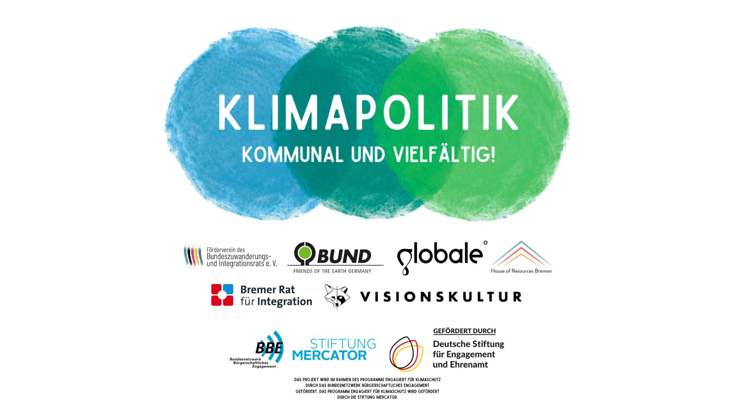 „Klimapolitik – kommunal und vielfältig!“ ist ein Projekt des Bundeszuwanderungs- und Integrationsrats in Kooperation mit folgenden Projektpartnern in Bremen: Bremer Rat für Integration (BRI), BUND Bremen, globale° Literaturfestival, House of Resources (TJV e.V.), Visionskultur. Ziel ist eine stärkere Einbindung von Menschen mit Migrations- oder Fluchtgeschichte in kommunale Klimaschutzprozesse.